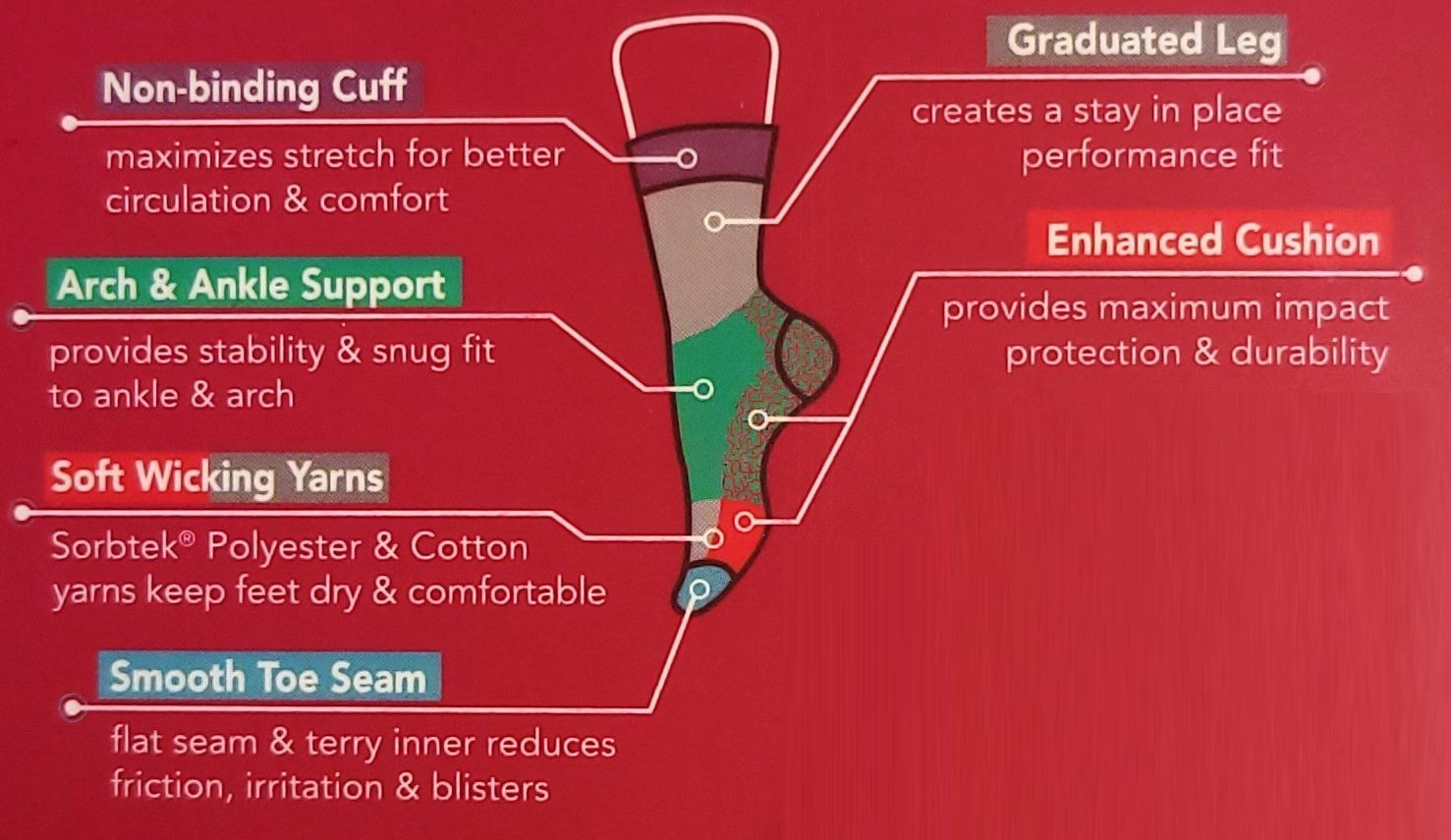 Dr Motion's Outdoor Compression Crew Socks offer 360 degrees of support with a complete compression body and enhanced spandex. Strategic ankle support allows for unrestricted motion while TruDry technology provides maximum wicking and comfort. Breathable mesh upper and terry cushioning provide additional support and protection, and the non-binding comfort band ensures maximum comfort. These socks are perfect for athletes looking for advanced dynamic support.